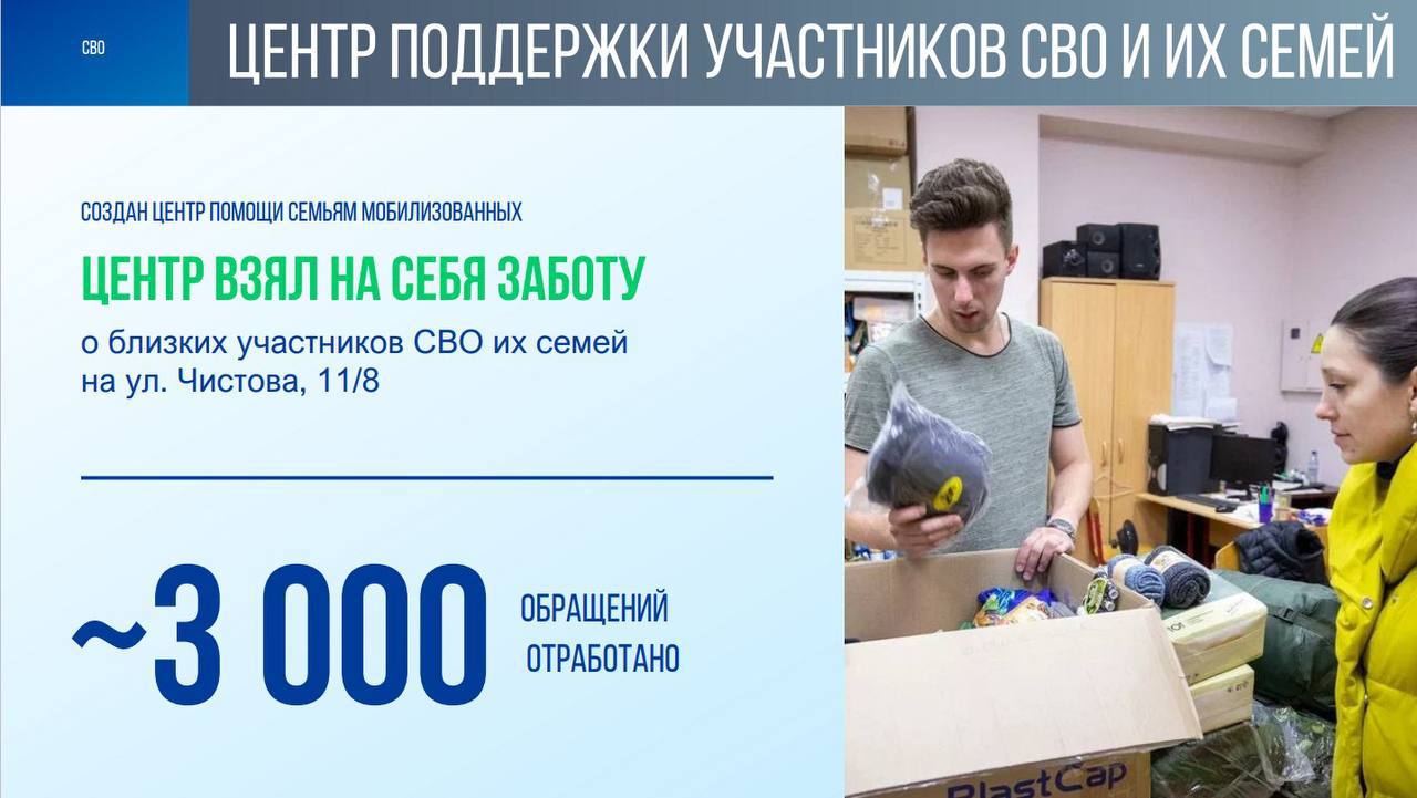 Особая забота о жёнах, детях, родителях бойцов. Обработали около 3000 обращений от родных военнослужащих. Практически в круглосуточном режиме на связи сотрудники центра на ул. Чистова. Принимается каждая просьба, будь то оказание гуманитарной, юридической, медицинской, социальной или психологической помощи.