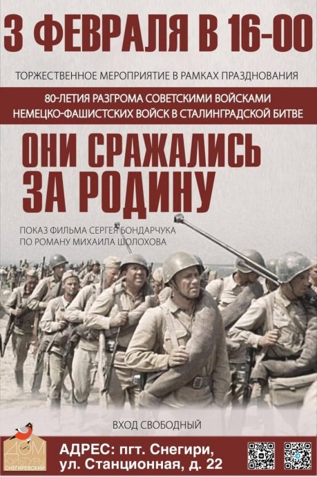 3 февраля в 16-00 в Снегиревском доме культуры состоится торжественное памятное мероприятие и кинопоказ фильма Сергея Бондарчука «Они сражались за Родину», посвященные этим великим событиям.