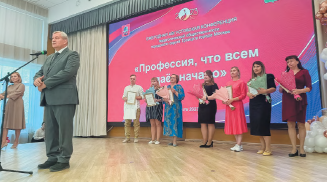 Троицких педагогов поздравили почётные гости – первый зампрефекта ТиНАО Игорь Окунев и депутат Мосгордумы Валерий Головченко. Они вручили грамоты работникам троицкого просвещения. Высшей награды от минпросвещения России за многолетний труд удостоилась учитель-логопед дошкольного отделения Гимназии Татьяна Теленченко. Больше 30 лет она отдала работе с детьми. «Рада, что в 2002 году пришла в этот детский сад, – рассказала логопед. – Я очень люблю помогать детям, сотрудничать с коллегами и всегда стараюсь развиваться в своей профессии. Эта награда даёт стимул. Ни в коем случае нельзя опускать руки, нужно продолжать работать и совершенствовать свои навыки».