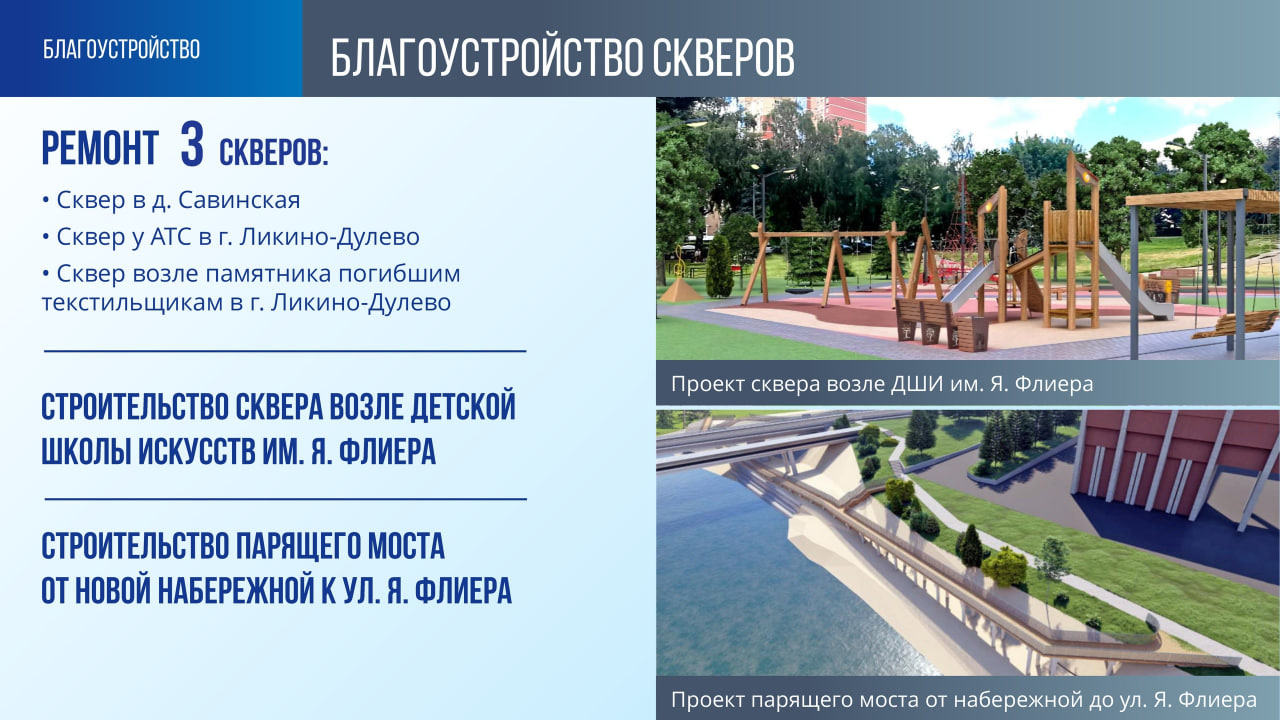 - Будет проведён ремонт трёх скверов — в г. Ликино-Дулёво у АТС и памятника погибшим текстильщикам, а также в д. Савинская.