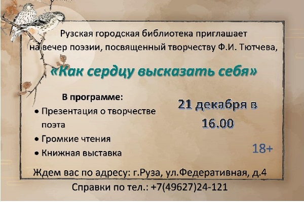 21 декабря в Рузской городской библиотеке состоится вечер поэзии «Как сердцу высказать себя», посвященный юбилею Фёдора Тютчева. Начало в 16 часов.