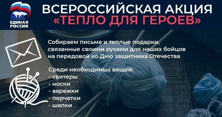 Жители Павловского Посада примут участие во Всероссийской акции «Тепло для героя». Ее организаторами выступила отделение Партии «Единая Россия» Московской области. Местные отделения Партии «Единая Россия» в Московской области в рамках мобилизационного партийного проекта «Старшее поколение» и направления «Долголетие для всех» организуют мероприятия в рамках Всероссийской акции «Тепло для героя». «Серебряные» волонтеры и люди старшего поколения с активной жизненной позицией со всей страны могут отправить российским военнослужащим письма со словами поддержки и теплый подарок, связанный своими руками ко Дню защитника Отечества. Акция пройдет до 23 февраля. Необходимый список вещей: свитеры, носки, варежки, перчатки, шапки. Каждый желающий принять участие в акции «Тепло для героя» может принести вязаные вещи местное отделение партии «Единая Россия» по адресу: пл. Революции, 15. На сегодняшний день в сотрудники и гости Дома культуры «Евсеевский» принимают в ней активное участие.