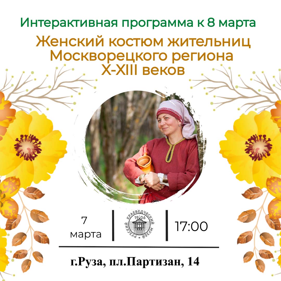 7 марта, в преддверии Международного женского дня, Рузский краеведческий музей приглашает жителей Рузского городского округа на интерактивную программу «Женский костюм жительниц Москворецкого региона X-XIII веков».