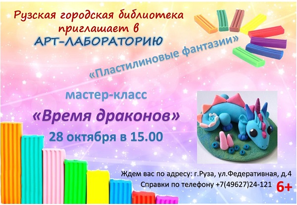 В арт-лаборатории «Пластилиновые фантазии» Рузской городской библиотеки 28 октября в 15 часов состоится мастер-класс «Время драконов».