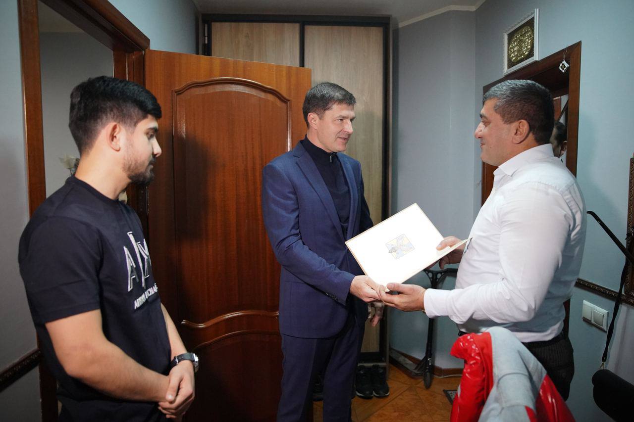 Глава городского округа Люберцы Владимир Волков посетил Мугабила Гаджи оглы Бабаева, поблагодарил за помощь в задержании мужчины, совершившего вчера нападение на люберчан на улице Кирова, вручил ему сертификат на квартиру в новом микрорайоне Зенино.