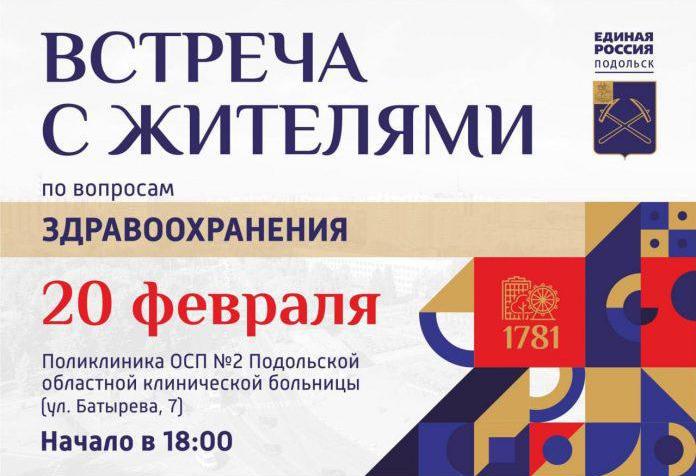 20 февраля в 18:00; поликлиника ОСП № 2 Подольской областной клинической больницы (ул. Батырева, д. 7). Приглашаются жители Северного и Южного микрорайонов.