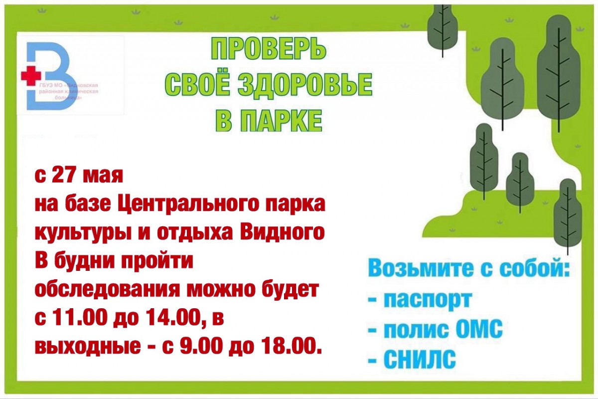 27 мая, в субботу, состоится первое мероприятие по диспансеризации взрослого населения в таком формате. С этой даты ежедневно жители Видного также смогут не только приятно провести время в парке, но и проверить состояние своего здоровья. В будни пройти обследования можно будет с 11.00 до 14.00, в выходные - с 9.00 до 18.00.