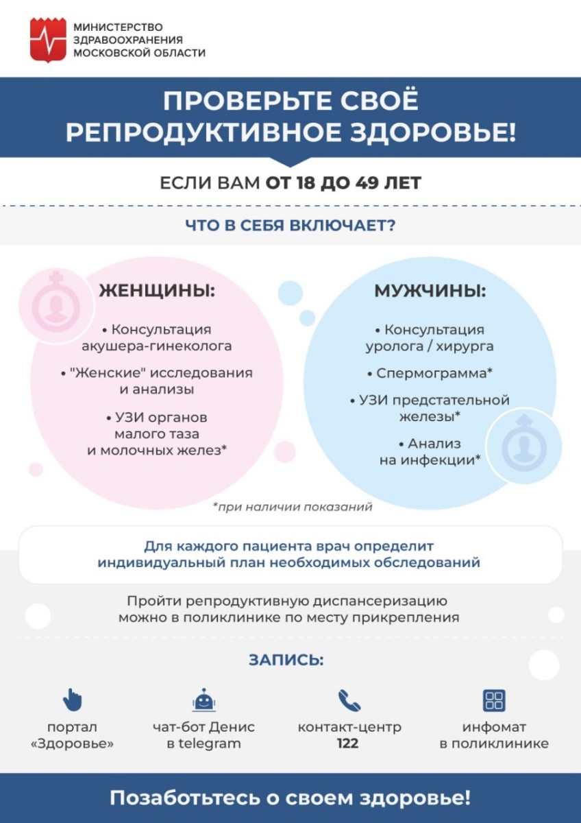 Репродуктивное здоровье — это возможность иметь детей. В Подмосковье провериться могут бесплатно жители от 18 до 49 лет.